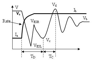 - 当电流按电流上升率Rate爬升后,由于输出线路感抗及电容ESL的影响,输出电压将与电流爬升波形同步跌落至VESL,形成电压波形的第一个波谷。